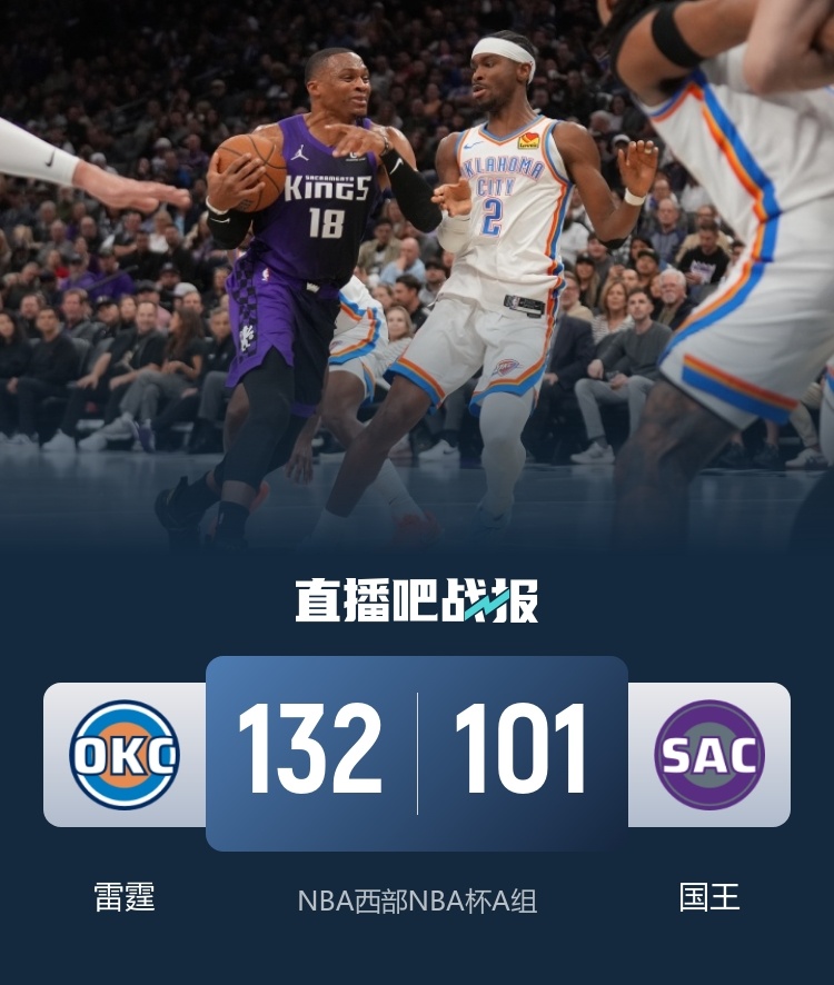 NBA杯-雷霆31分大胜国王 哈滕新高33+19 SGA30分 威少24+9
