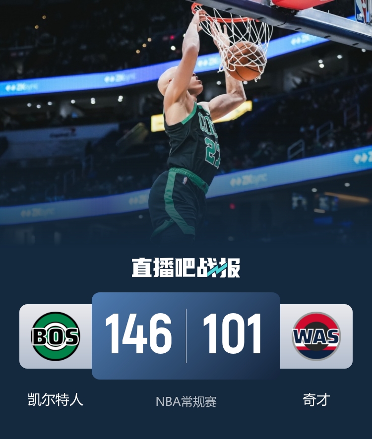 一开场,凯尔特人反客为主打出11-4的开局,奇才不断冲击内线连投带罚努力追赶,凯尔特人连中三分稳住局势,次节奇才命中率下降,凯尔特人打出17-5扩大领先,此后奇才大举反击,尚帕尼劈扣打成2+1,帮助球队轰出12-0的攻击波迫近比分,半场战罢凯尔特人66-59领先奇才。易边再战,凯尔特人牢牢占据场上主动,怀特和沃尔什联手带队扩大分差,末节奇才完全哑火,安芬尼·西蒙的独中4记三分帮助球队轰出21-5领先39分,奇才大势已去无力回天。最终,凯尔特人146-101大胜奇才,客场过关。