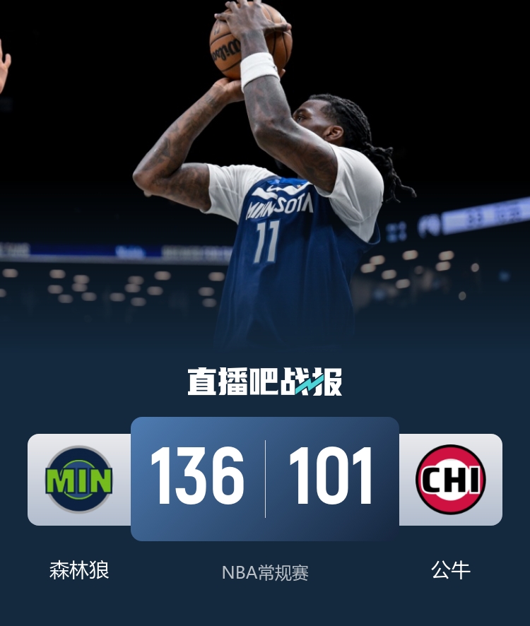 开场后两队就打得比较胶着,森林狼抢占先机,公牛随后回应攻势将比分反超,怀特没有打多久就受伤离场。第二节上来公牛进攻端多点开花依旧打得顺畅,武切维奇和吉迪轮番拿分帮助公牛保持领先,爱德华兹重新登场后连续得分为森林狼掀起反扑,森林狼在上半场结束前打出高潮完成反超。易边再战,吉迪刚上来不久也受伤离场,随后爱德华兹再次展现得分能力,他带领森林狼逐渐将分差拉大,里德手感火热也是接连拿分。最后一节里德延续状态帮森林狼将分差拉大到20分以上,公牛彻底崩盘,最终森林狼136-101大胜公牛结束2连败,公牛遭遇2连败。